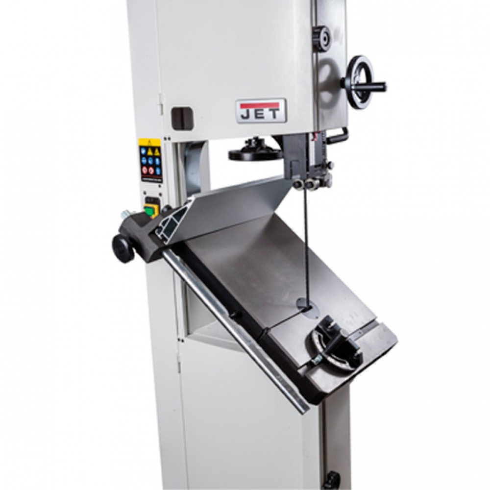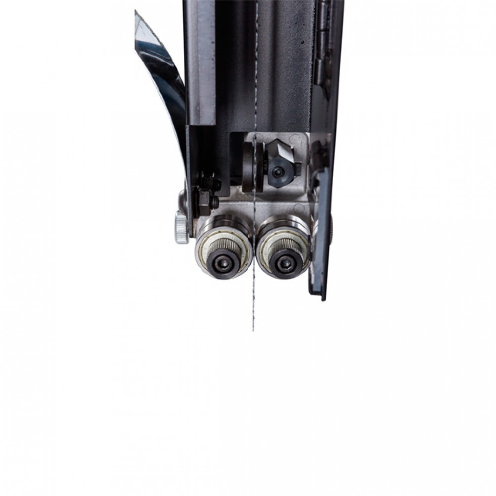 Jet JWBS-15 - стрічкова пилка нового покоління, призначена для професійного використання. Її основна перевага на тлі аналогів минулих поколінь - збільшена висота розпилювання. Цей параметр дуже важливий для тих, кому потрібен універсальний верстат, здатний взяти на себе ділильні функції. До подібних робіт пристосований і паралельний упор: напрямний профіль можна встановити вертикально на бічну грань так, щоб надійно фіксувати плоскі заготівлі при розпуску на тонкі пластини. В цілому конструкція бічного упору дуже добре опрацьована і відповідає найсуворішим вимогам: профіль жорсткий і міцний, закріплений на масивному чавунному кронштейні, який переміщається циліндричною направляючою. Передбачена груба (вручну) та точна (мікрометричним гвинтом) установка.